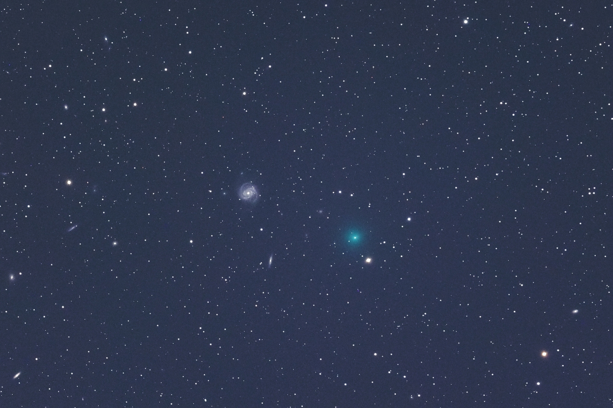 24PとM100との最接近を撮るために、不安定な天候の中を撮影に行きました。コンポジットのためにもっと撮影枚数を増やしたかったのですが、雲が流れてくる状況の中、連続して8枚撮影するのが精一杯でした。12cm屈折30倍で眼視でも確認しました。M100(9.4等)より少し暗かったので、明るさは10.0等程度だったと思われます。雲が広がってしまったので撮影を終了しましたが、それから約10分後には強風が吹き出し、吹雪のような天候になってしまいました。