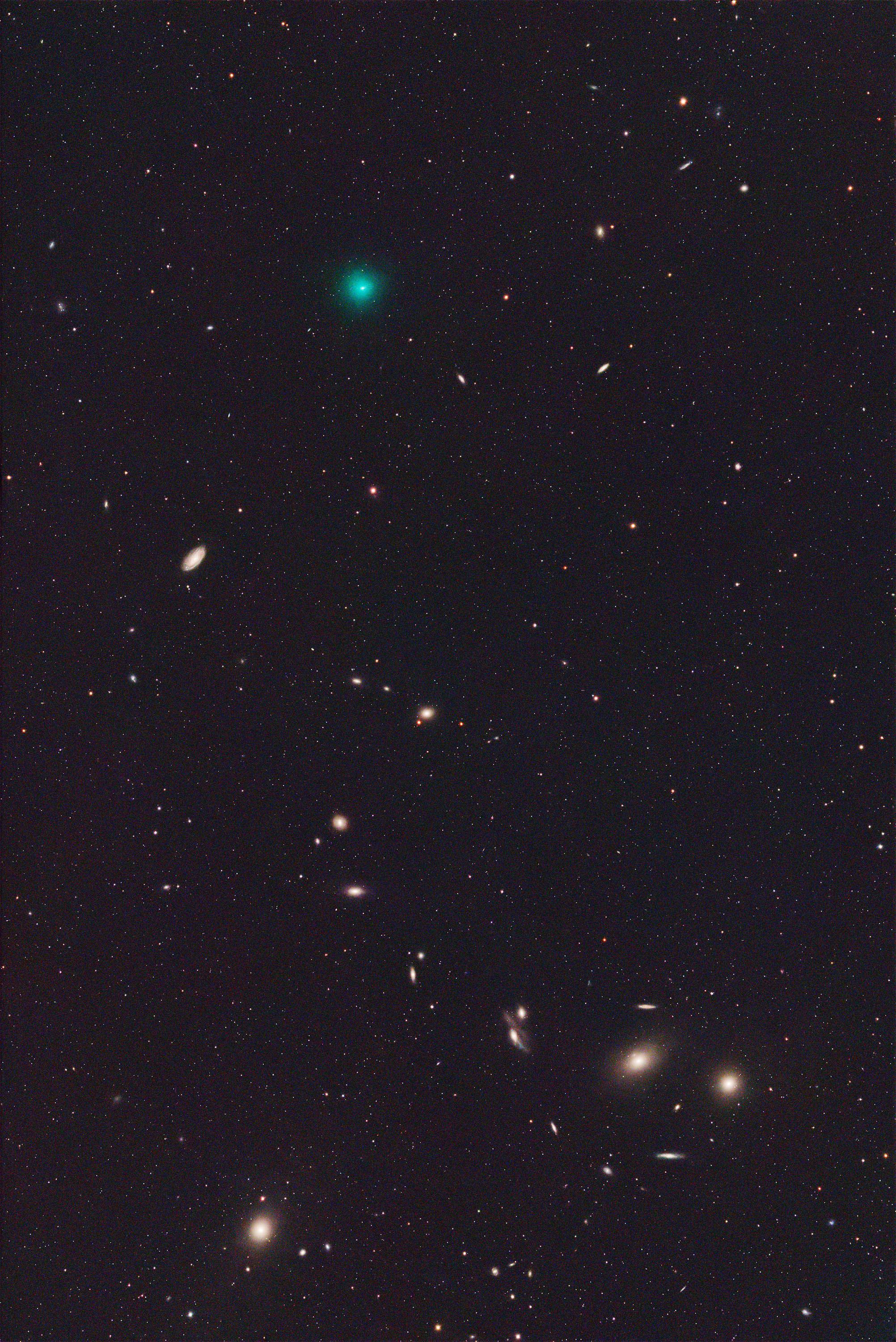 おとめ座銀河団マルカリアンチェーンの前を通過するショーマス彗星。一瞬、その鎖に連なるかのようでした。 彗星は数分でも流れてしまうため、3分を2枚だけスタックし、ノイズはNXTで無理矢理押さえ込んでいます。
