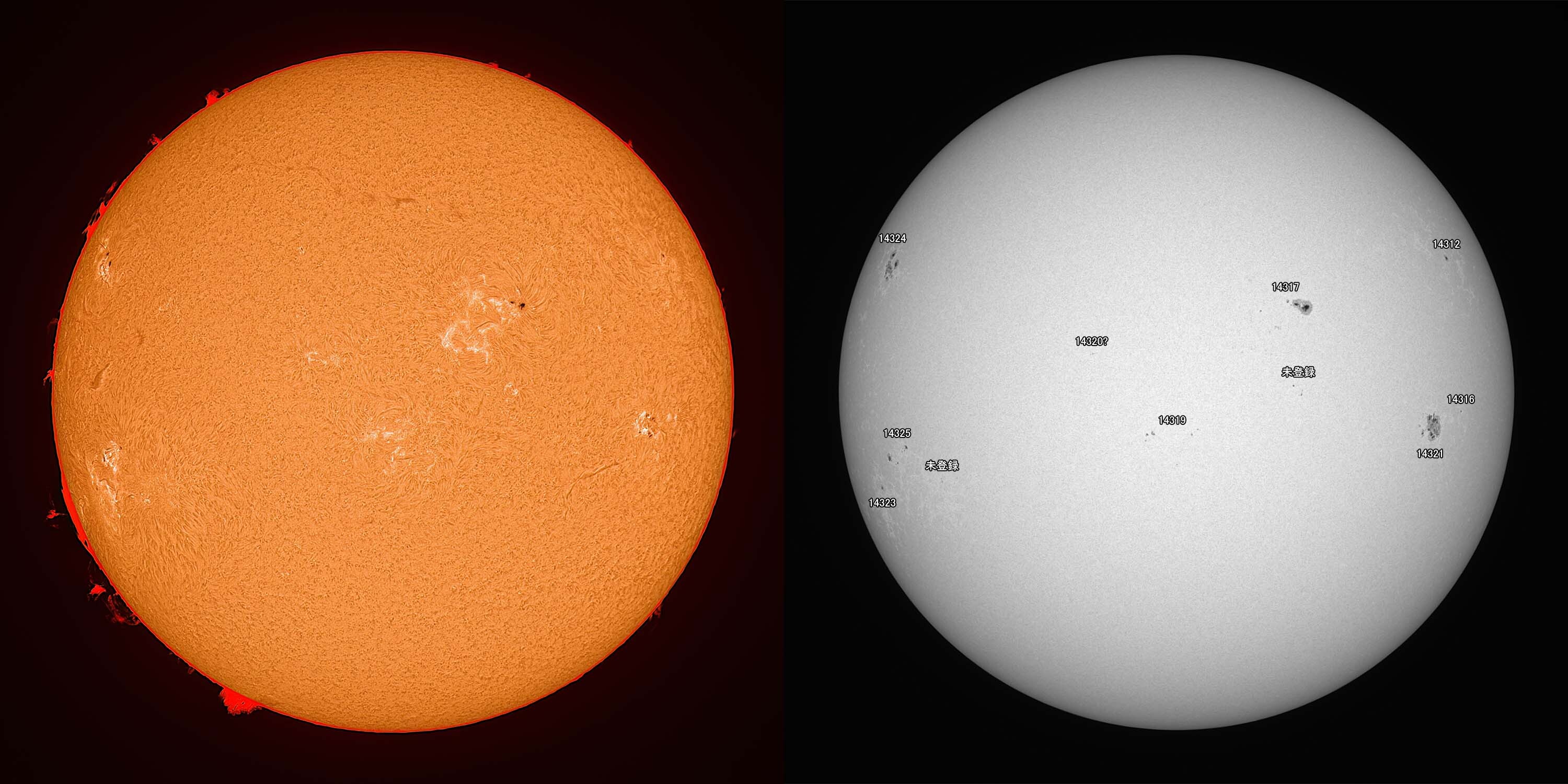 光球面:FireCapture、ROI 3600x2400、Gain 100、1.75msec x1000、撮影時間 31秒/プロミネンス:FireCapture、ROI 3600x2400、Gain 300、1.75msec x1000、撮影時間 31秒