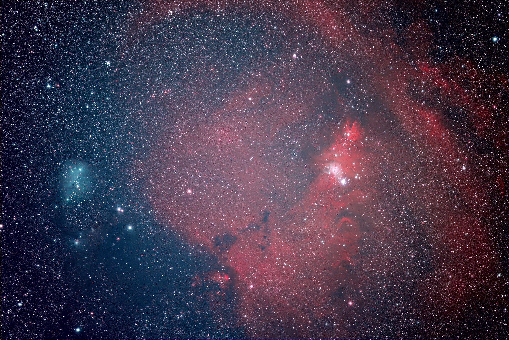 カタツムリ星雲の青とクリスマスツリー星団の赤の対比がきれいです