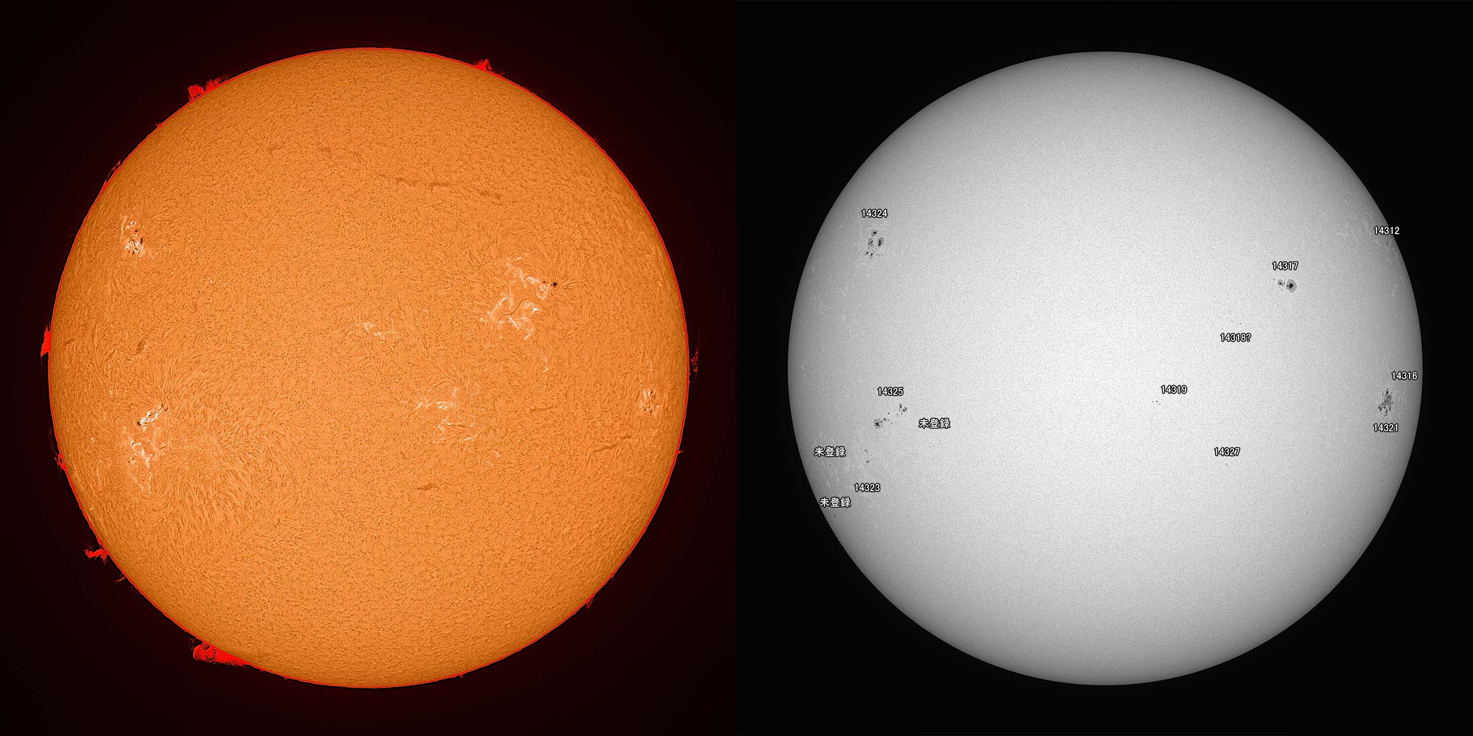 光球面:FireCapture、ROI 3600x2400、Gain 100、1.75msec x1000、撮影時間 31秒/プロミネンス:FireCapture、ROI 3600x2400、Gain 300、1.75msec x1000、撮影時間 31秒
