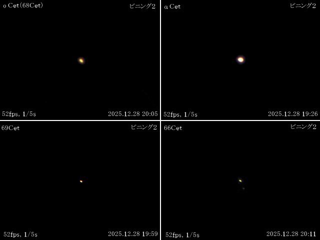 ミラ、くじら座α、69番星、66番星はそれぞれ画像に示した条件で撮影した動画から14枚、74枚、46枚、64枚を、スタック処理に使ったので、露出に換算すると0.269秒、1.42秒、0.885秒、1.23秒となります。