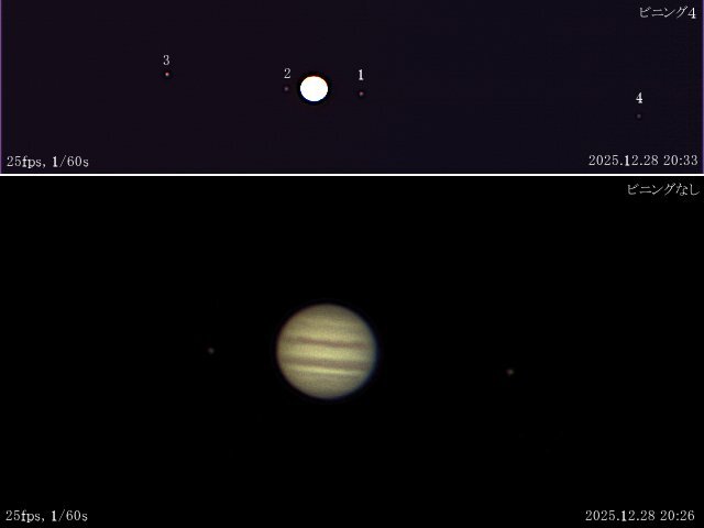 画像に示した条件で撮影した動画から、ビニングなし、ビニング4でそれぞれスタック処理に637枚、1052枚を使ったので、露出に換算するとそれぞれ10.6秒、17.5秒となります。