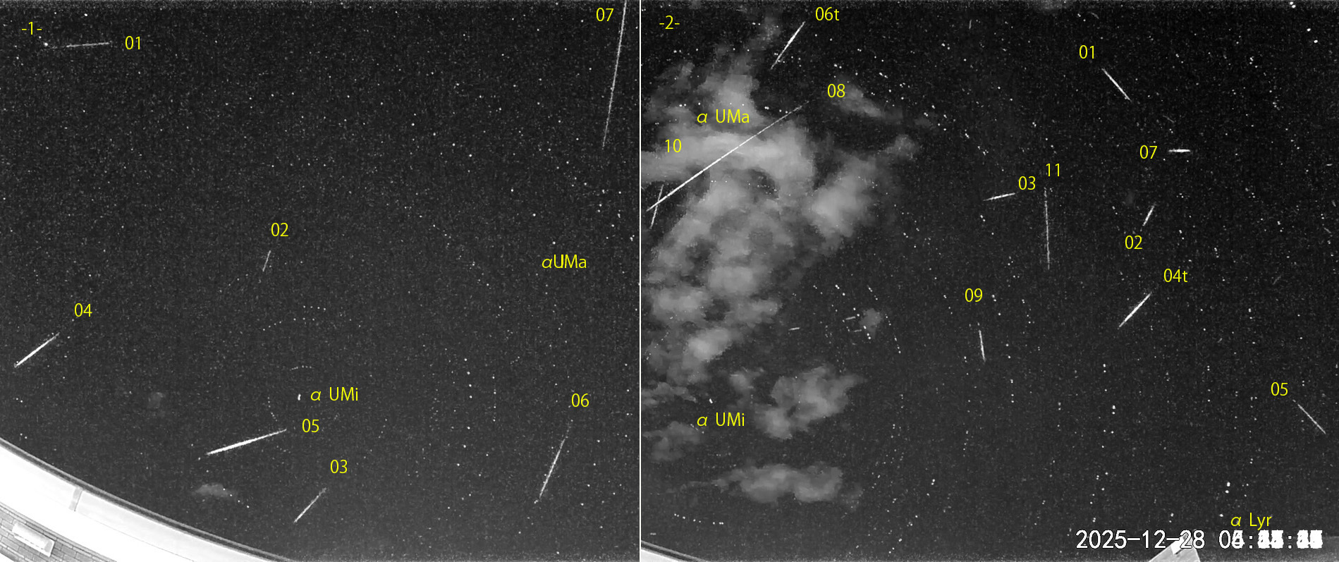 1) 01:08から約2時間の7コマを、2) 03:21から約2時間の11コマを処理しました。05時台後半から薄雲あり。 出現した順に数字と記号を始点付近に記入。tは痕traceあり。 【流星群記号】Hy:うみへび座流星群、Co:かみのけ座流星群、Q:しぶんぎ座流星群