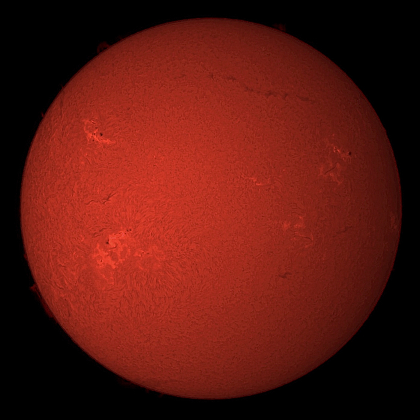 12/30の太陽です。また、画像処理法を変えました。撮影は2ミリ秒(今までは8ミリ秒)。ステライメージ10の太陽Hα画像補正のみにしました。