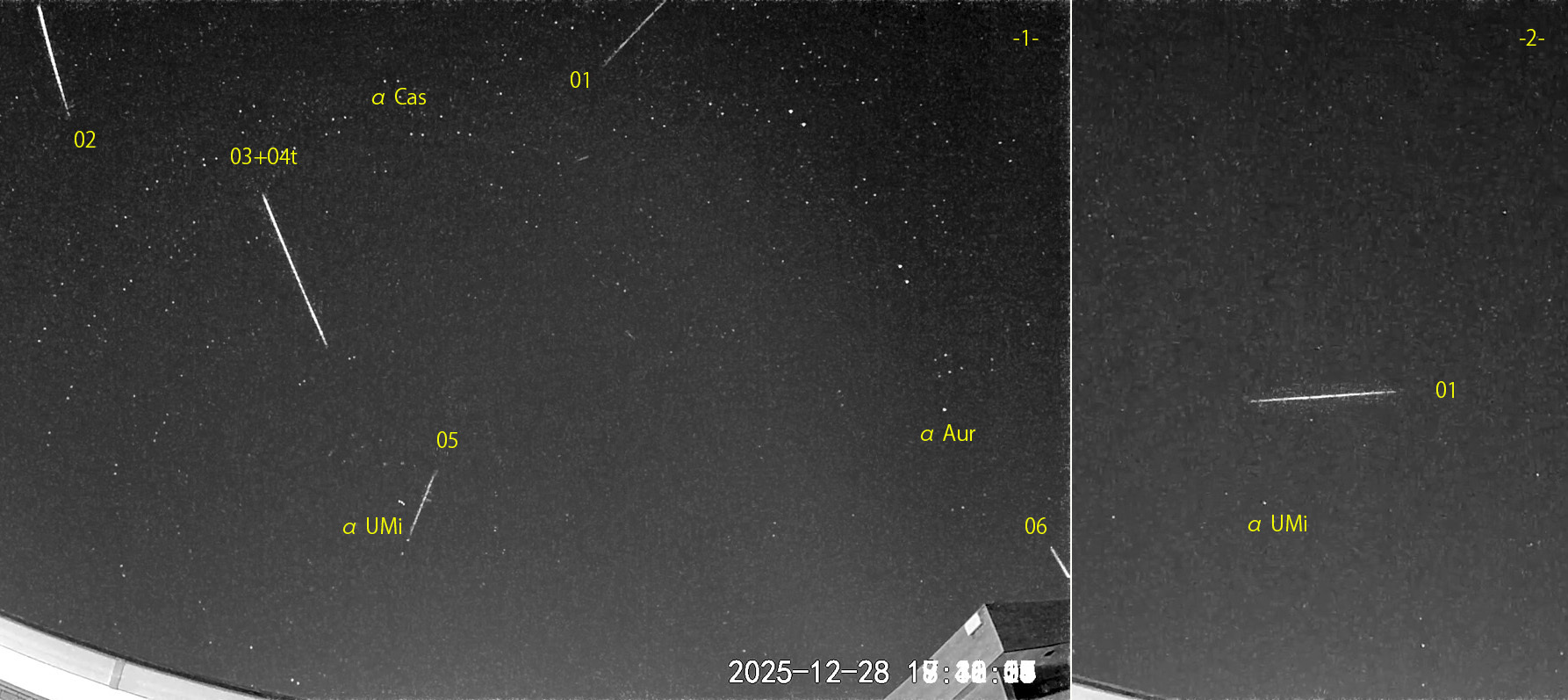 1) 17:13から約2.5時間の6コマを、2) 23:22から約0.5時間の1コマを処理しました。 出現した順に数字と記号を始点付近に記入。tは痕traceあり。 【流星群記号】Hy:うみへび座流星群、Co:かみのけ座流星群、Q:しぶんぎ座流星群 天候は良かったが、流星活動が低調でした。