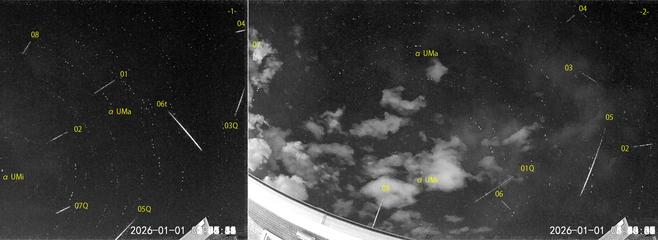 1) 00:40から約2時間の6コマを、2) 03:18から約2時間の8コマを処理しました。03時以降は薄雲多し。 出現した順に数字と記号を始点付近に記入。tは痕traceあり。 【流星群記号】Hy:うみへび座流星群、Co:かみのけ座流星群、Q:しぶんぎ座流星群 しぶんぎ群の活動が始まったようです。