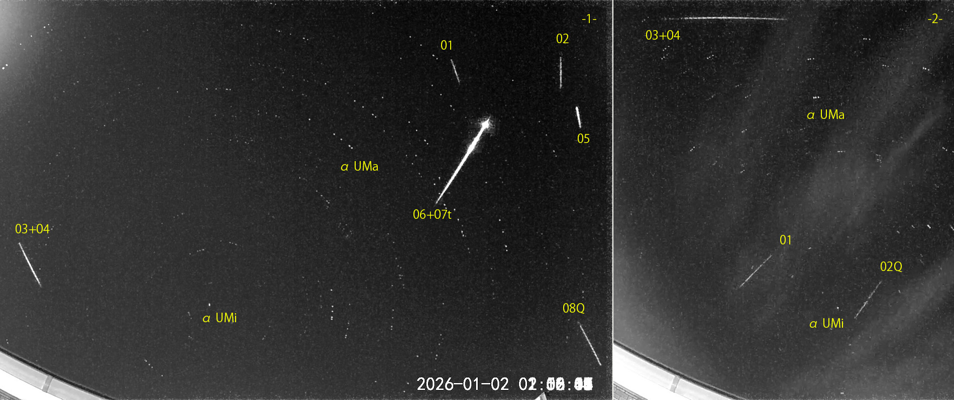 1) 01:52から約1時間の8コマを、2) 05:08から約0.5時間の4コマを処理しました。03-05時は雲多し。 出現した順に数字と記号を始点付近に記入。tは痕traceあり。 【流星群記号】Hy:うみへび座流星群、Co:かみのけ座流星群、Q:しぶんぎ座流星群