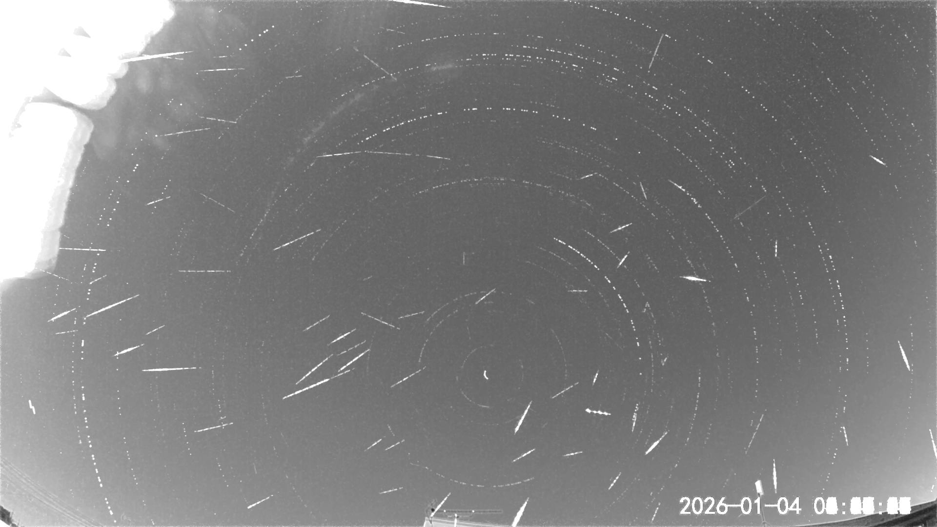 01/04未明のしぶんぎ座流星群です。00:27:54に最初の出現、06:02:00に最後の2つです。2〜3個ほぼ同時に出現した時も多く、盛況だった感じです。左側の明るいものは満月とそのゴーストです。