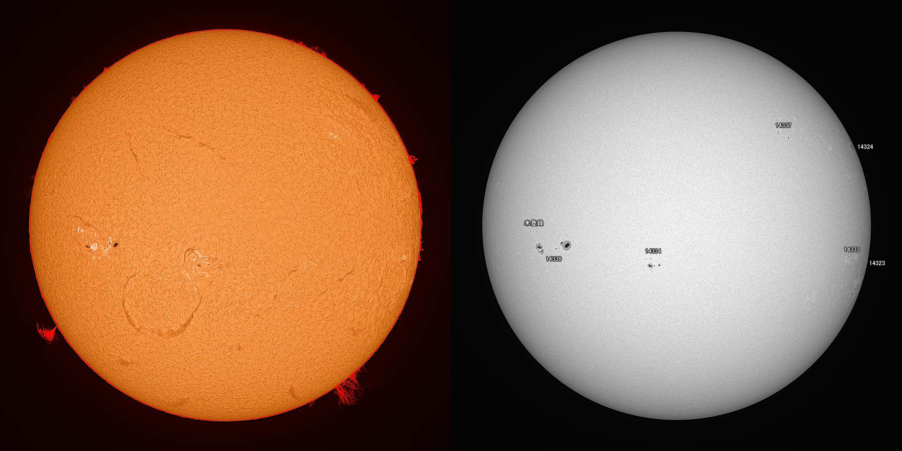 光球面:FireCapture、ROI 3600x2400、Gain 100、1.65msec x1000、撮影時間 31秒/プロミネンス:FireCapture、ROI 3600x2400、Gain 300、1.65msec x1000、撮影時間 31秒