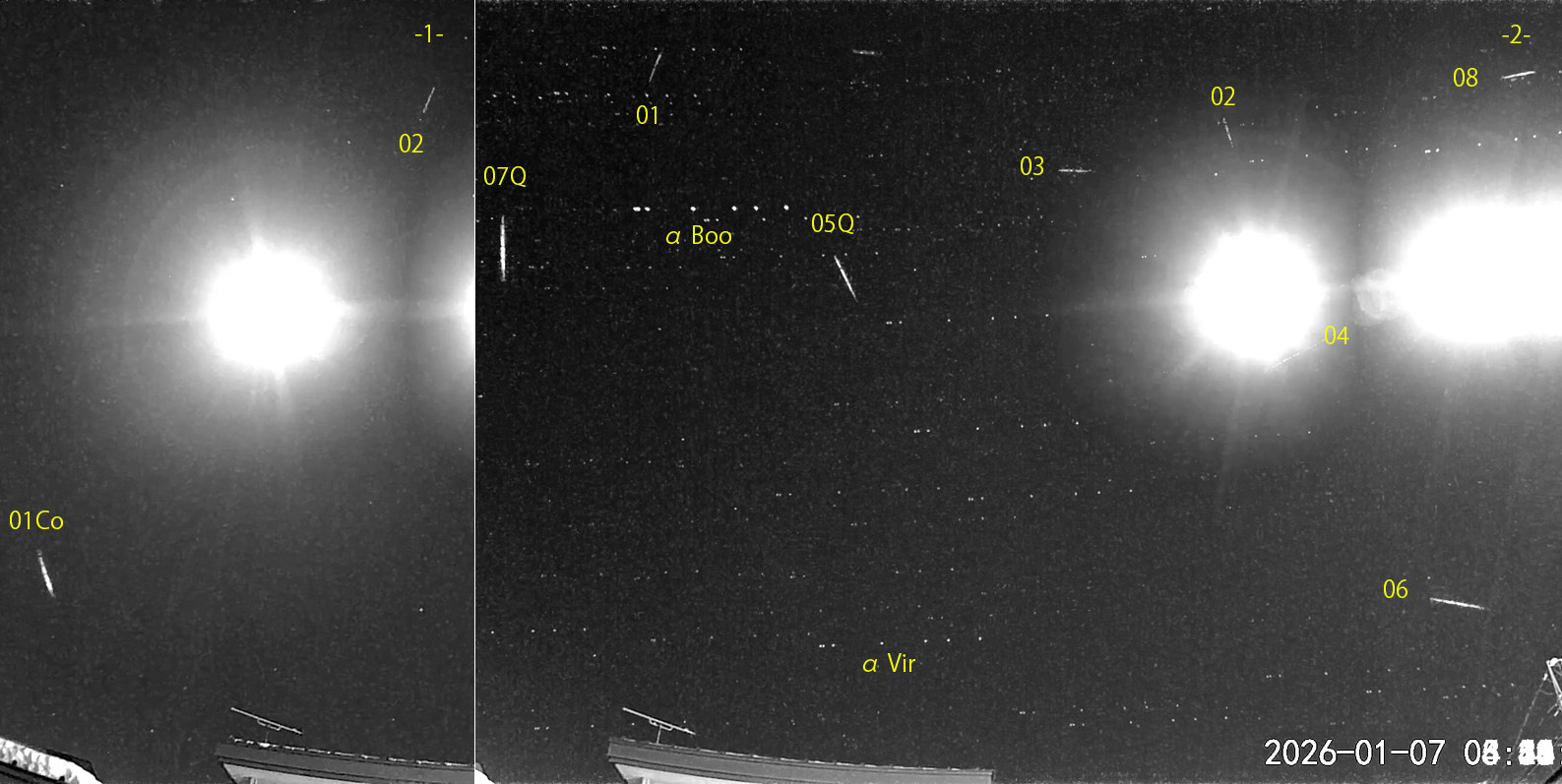 1) 00:57から約1.5時間の2コマを、2) 03:50から約2時間の8コマを処理しました。 出現した順に数字と記号を始点付近に記入。tは痕traceあり。【流星群記号】Co:かみのけ座流星群、Q:しぶんぎ座流星群 見ていませんが、レグルス食があった日です。朝の最低気温は、昨日と同じマイナス18℃でした。