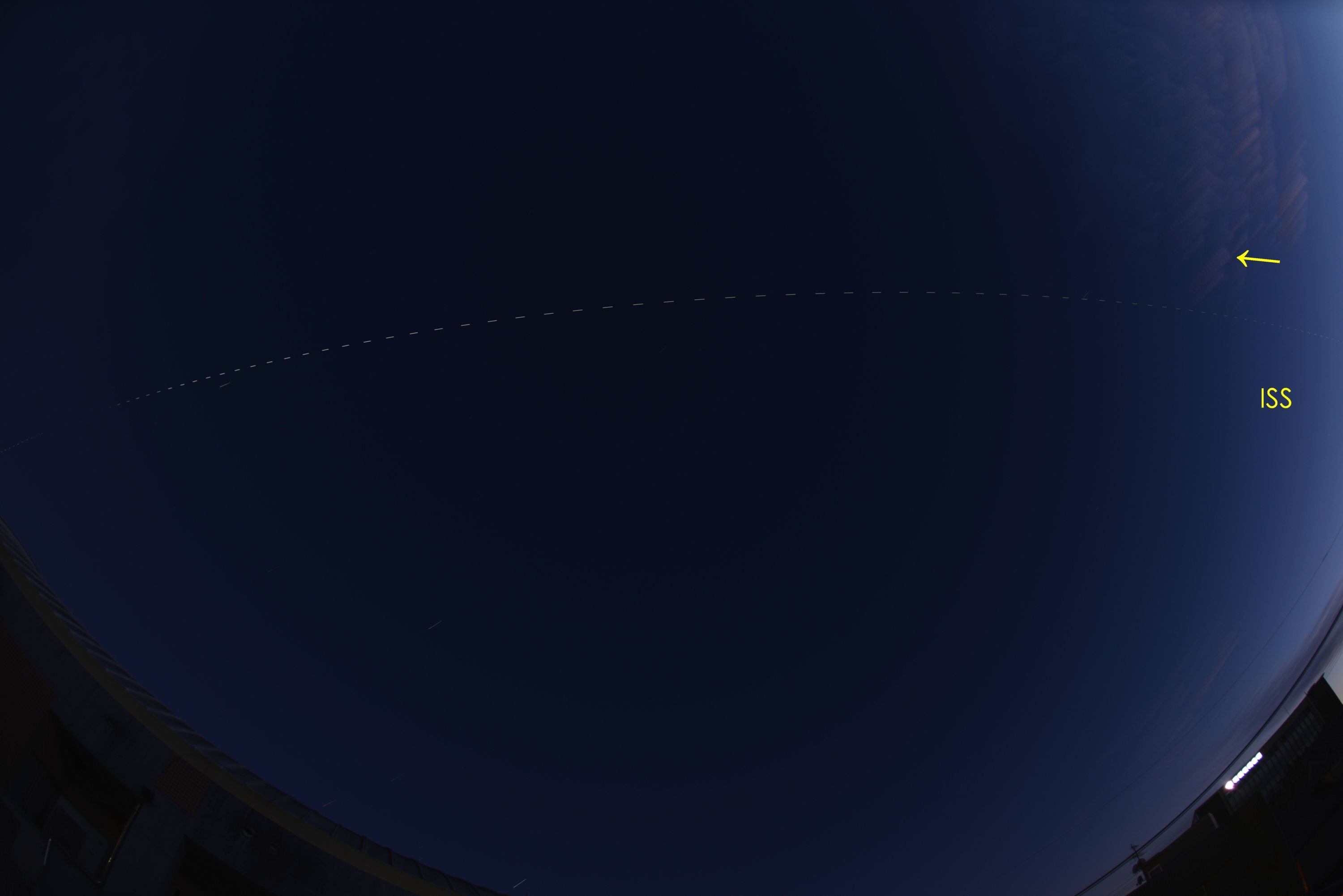 昨夜に引き続き夕焼けが残る空の中、音もなくISSが天頂を通過しました。油井さん、大きく手を振る私が見えましたか? 1秒露出、2秒休止を120回繰り返し。