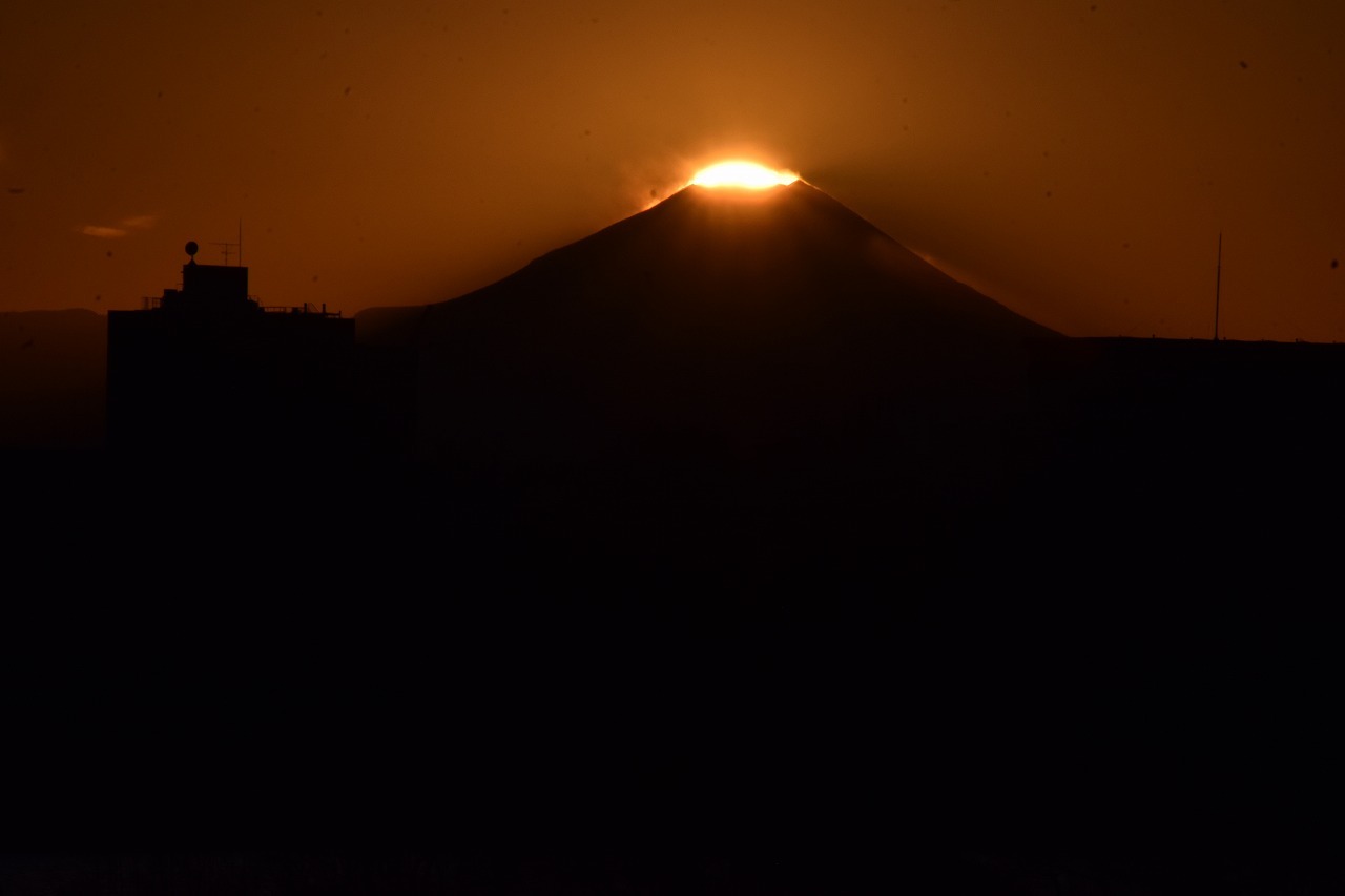 埼玉県川口市の荒川土手から撮影したダイヤモンド富士です。太陽の縁が斜面に接してから2分30秒後の様子です。太陽の上の縁は山頂のほぼ中央に沈んでいきました。
