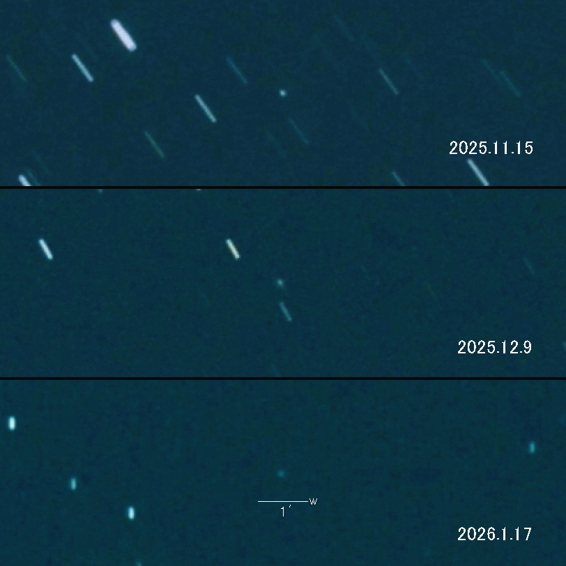 2025.11.15 → 15等級前半 2025.12.9 → 15等級前半 2026.1.17 → 15等級後半 徐々に集光が弱まっているイメージです。 2026年2月25日が近日点ですが 地球との位置関係により2025年11月頃が明るさのピークでした。