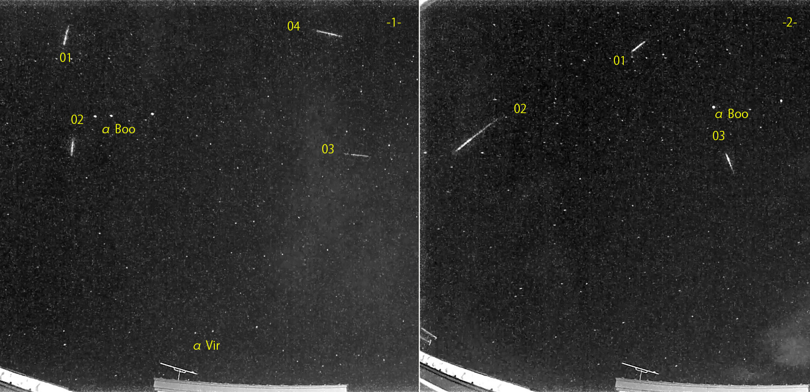 1) 02:03から約1時間の4コマを、2) 04:54から約1時間の3コマを処理しました。 出現した順に数字と記号を始点付近に記入。tは痕traceあり。【流星群記号】Co:かみのけ座流星群 ほぼ快晴、朝の最低気温マイナス15℃。