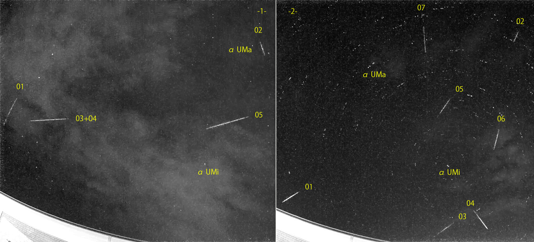 1) 00:45から約2時間の5コマを、2) 03:18から約2時間の7コマを処理しました。 出現した順に数字と記号を始点付近に記入。tは痕traceあり。【流星群記号】Co:かみのけ座流星群