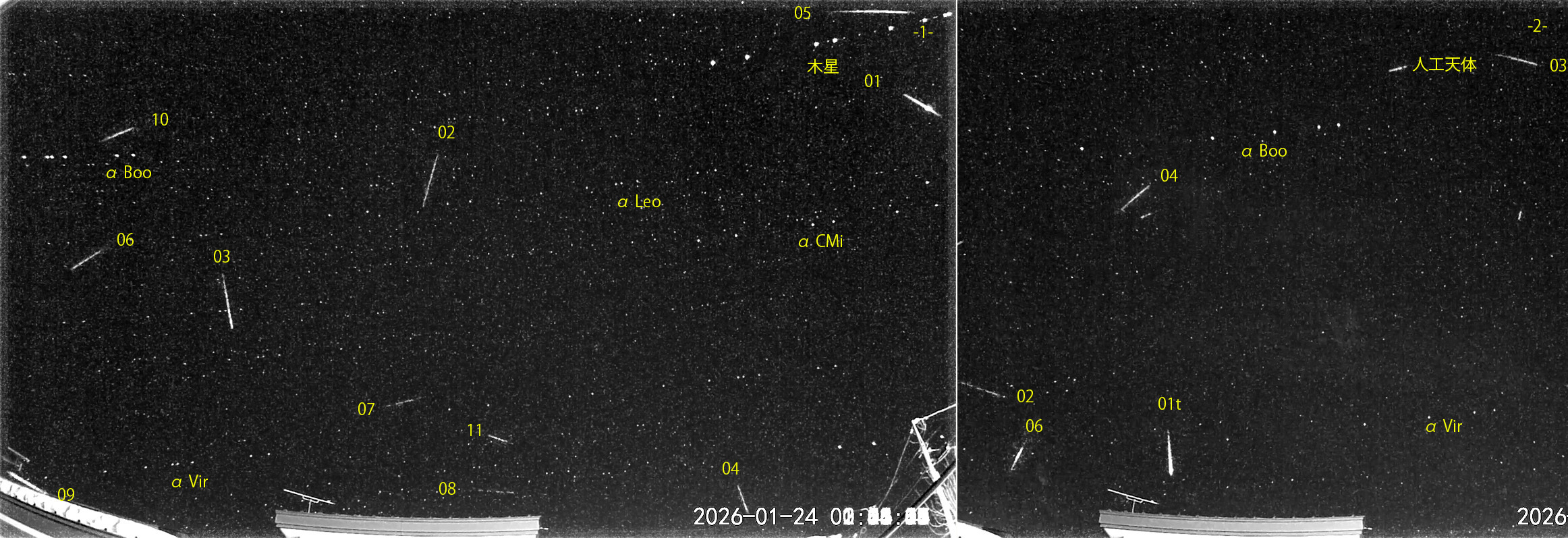 1) 00:38から約2.5時間の11コマを、2) 03:03から約2.5時間の5コマを処理しました。 出現した順に数字と記号を始点付近に記入。tは痕traceあり。【流星群記号】Co:かみのけ座流星群 前日夕方から快晴が続き、朝の最低気温はマイナス18℃。窓ガラス内側に霜がつきました。