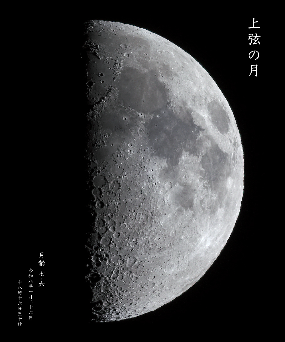 シーイング 1~2/5 シーイングは月の縁を見れば一目瞭然。極悪でした。上弦の月(ジャスト上限 13:47)の記録ということで、小さい扱いとシャープ処理で無理矢理仕上げました。