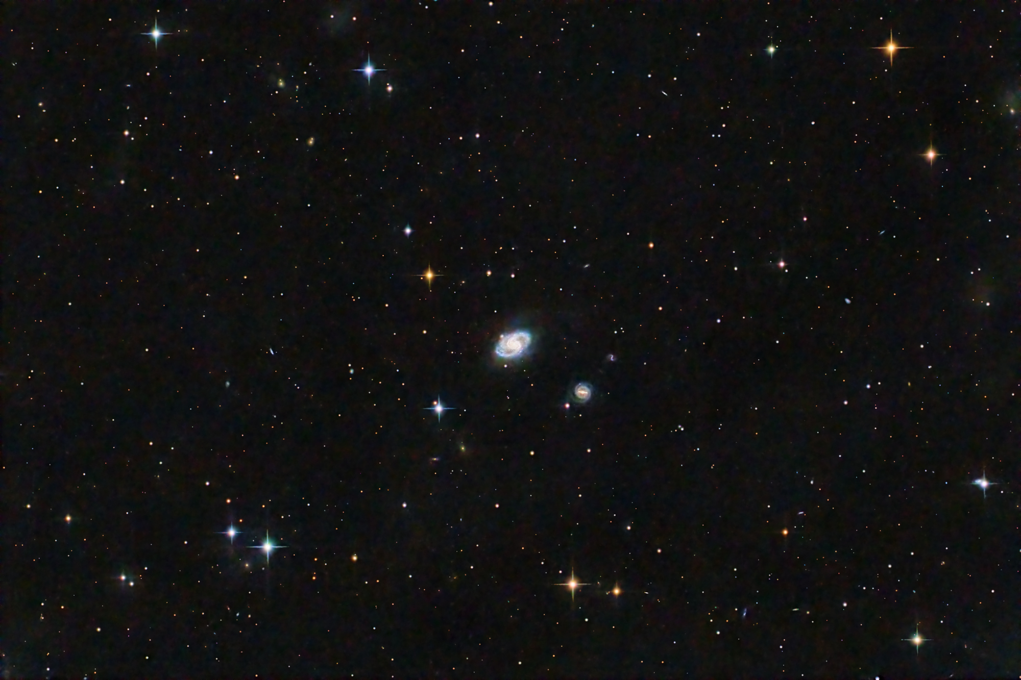 中心がNGC3583、右下が棒渦巻銀河のNGC3577です。2つの銀河は見かけ上近くにあるだけで、NGC3577は2倍以上遠いとされています。