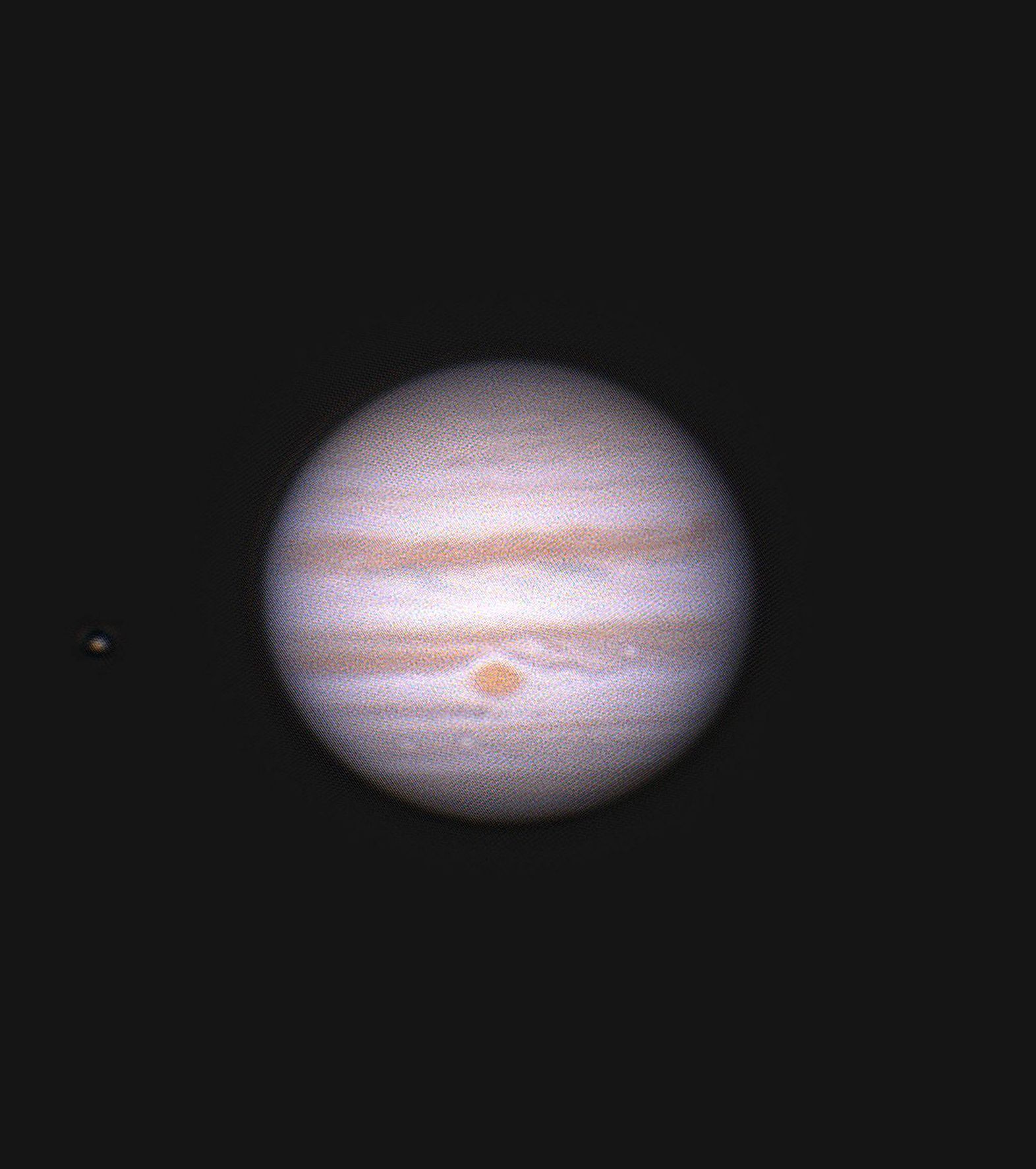 自宅の2階のベランダから撮影。望遠鏡のピントつまみとPCがやや離れているので、ジャスピンが難しいのですが、何とか木星の大赤斑までピント合わせができました。当日は長崎市のシーイングがよかったので、木星の縞と帯が撮影できました。