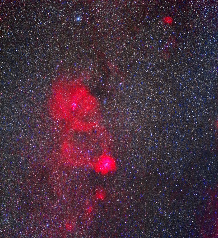 いっかくじゅう座の散光星雲 NGC2237「バラ星雲」の周辺です。南には上からSh2-280, 282, 283, 284と並んでいて北にはNGC2264がありますが、上端の輝星γGemの傍に南北に細長いループ構造が見られます。(片山 徹)