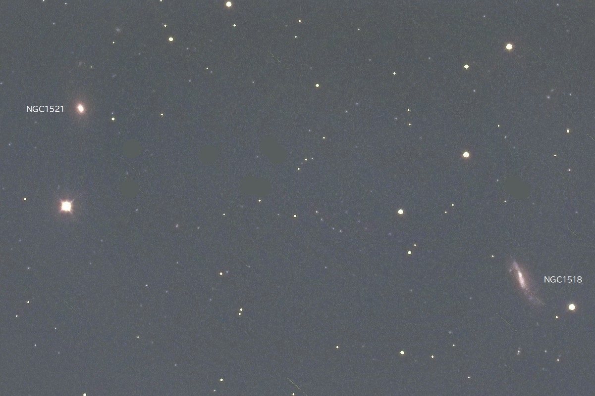 「エリダヌス座」にはτ星(タウ)がτ1~τ9まで9個ありますが、その中のτ9の北東3度強付近に位置する銀河2態です。 明るさとタイプは、NGC1518が11.79等(V)_SBd、NGC1521が11.57等(V)_Eです。