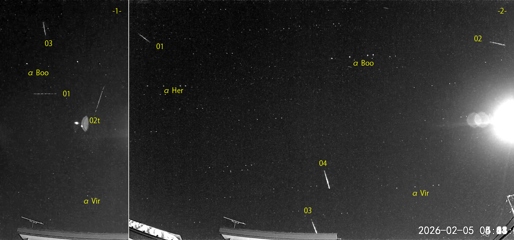1) 02:36から約1時間の3コマを、2) 04:44から約1時間の4コマを処理しました。快晴でしたが、朝の最低気温はマイナス5℃。 出現した順に数字と記号を始点付近に記入。tは痕traceあり。