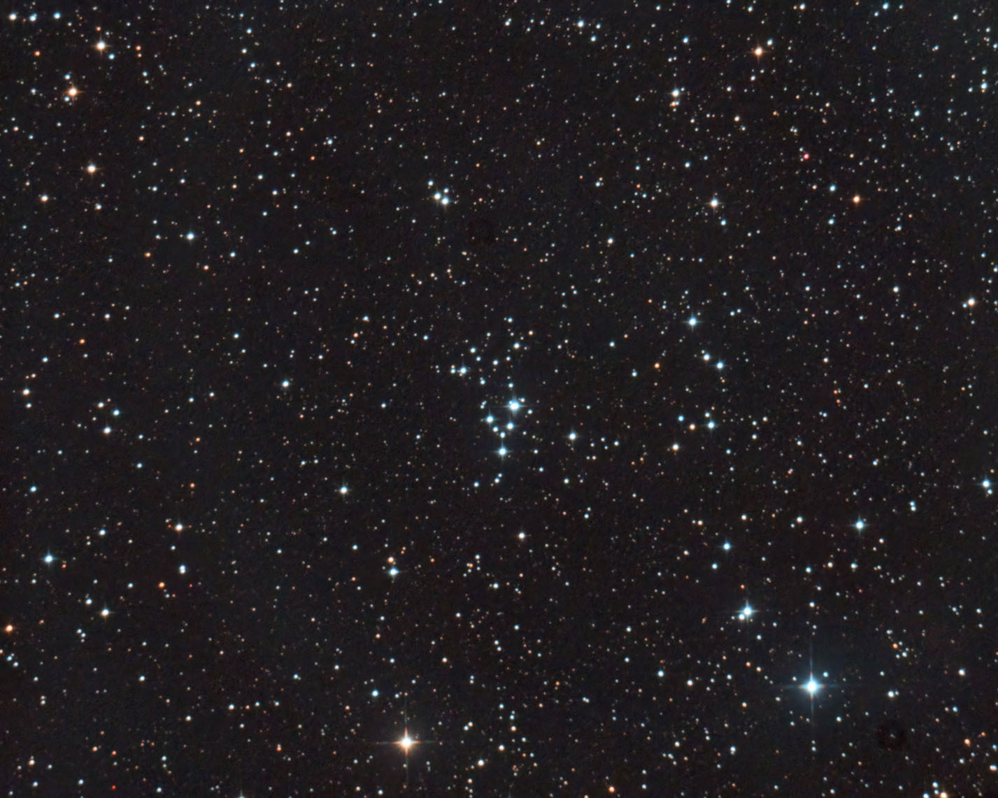 おおいぬ座の小さな散開星団ですが、チャーリー・ブラウンのクリスマスツリー星団と呼ばれているようです。逆立ちしていますが、たしかにかわいいクリスマスツリーを思い浮かべる散開星団です。右上の方向には小さな赤い惑星状星雲(PK235-03.1)が写っています。