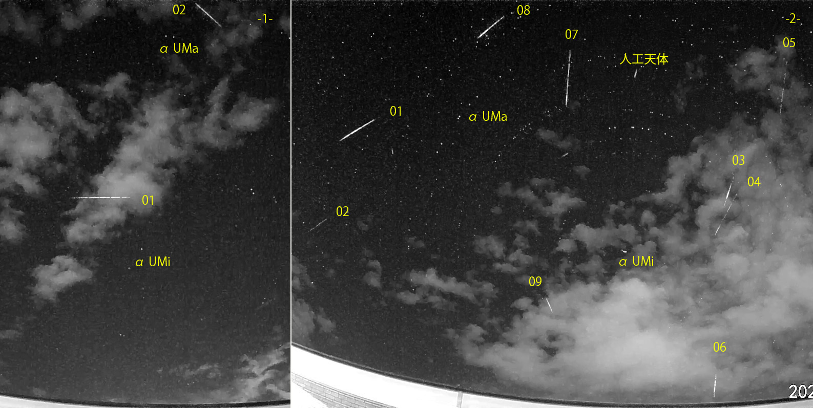 1) 00:49から約1.5時間の2コマを、2) 03:31から約2時間の9コマを処理しました。 出現した順に数字と記号を始点付近に記入。tは痕traceあり。 2コマ目の01と02、03と05~07は同系統の流星と思われます。