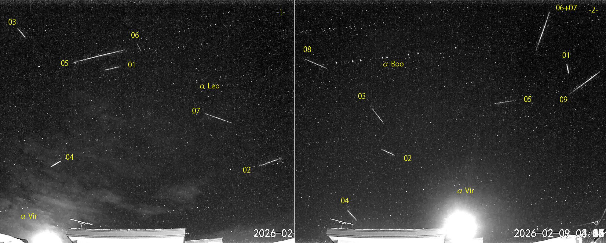 1) 00:21から約2時間の7コマを、2) 03:00から約2時間の9コマを処理しました。朝の最低気温はマイナス14℃。 出現した順に数字と記号を始点付近に記入。tは痕traceあり。 2月では最も多い流星数となりました。月の高度が低く、隣家の影になるので好都合です。