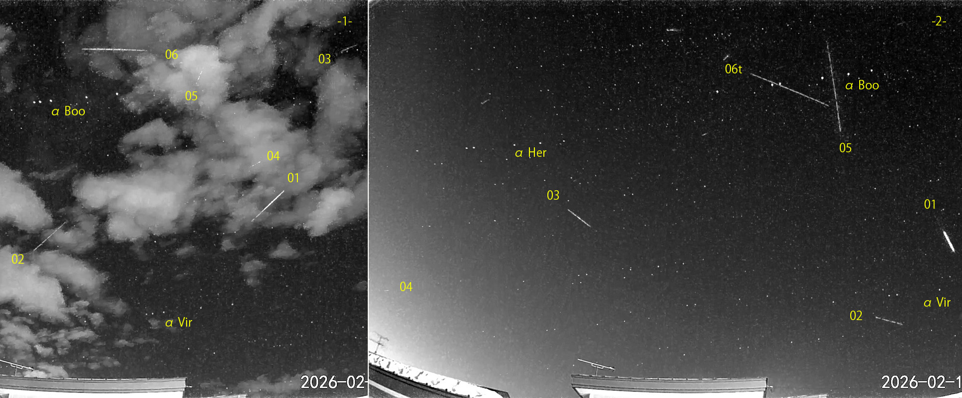 1) 02:36から約0.5時間の6コマを、2) 04:08から約1時間の6コマを処理しました。03-04時台は雲多し。 出現した順に数字と記号を始点付近に記入。tは痕traceあり。 朝の最低気温は、平年並みのマイナス14℃でした。