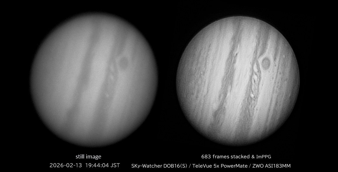 日没後から大気の揺らぎが小さく動画でも細かい模様が見えており期待したのですが、画像処理しても細部がカチッとしません。そんな中、19:45前後の10分間ほどの短い間、細部が復元できる動画が得られました。撮影しながら画像処理しシーイングを確認していますが、継続して良像が得られる日はめったに無いので冬場は寒さとの戦いです。