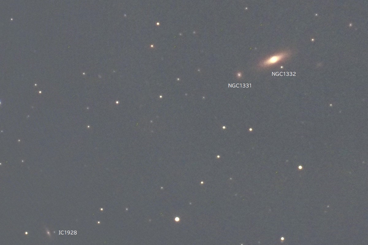「エリダヌス座」にはτ星(タウ)がτ1~τ9まで9個ありますが、その中のτ5の西1.8度付近に位置する銀河群で、前回投稿画像の左上(北東)に繋がる辺りです。 明るさとタイプは、NGC1332_10.36等(V)_E-So、NGC1331_13.42等(V)_E、IC1928_14.13等(B)_SABです。