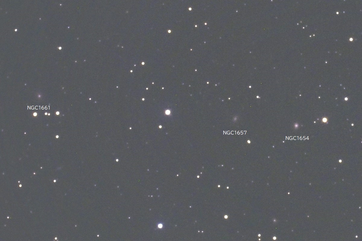 「エリダヌス座」51番星の北北東2.3度付近に位置する14等級の銀河3態です。 明るさとタイプは、NGC1654_14.36等(B)_SBa、NGC1657_14.94等(B)_SABb、NGC1661_14.24等(B)_SBC