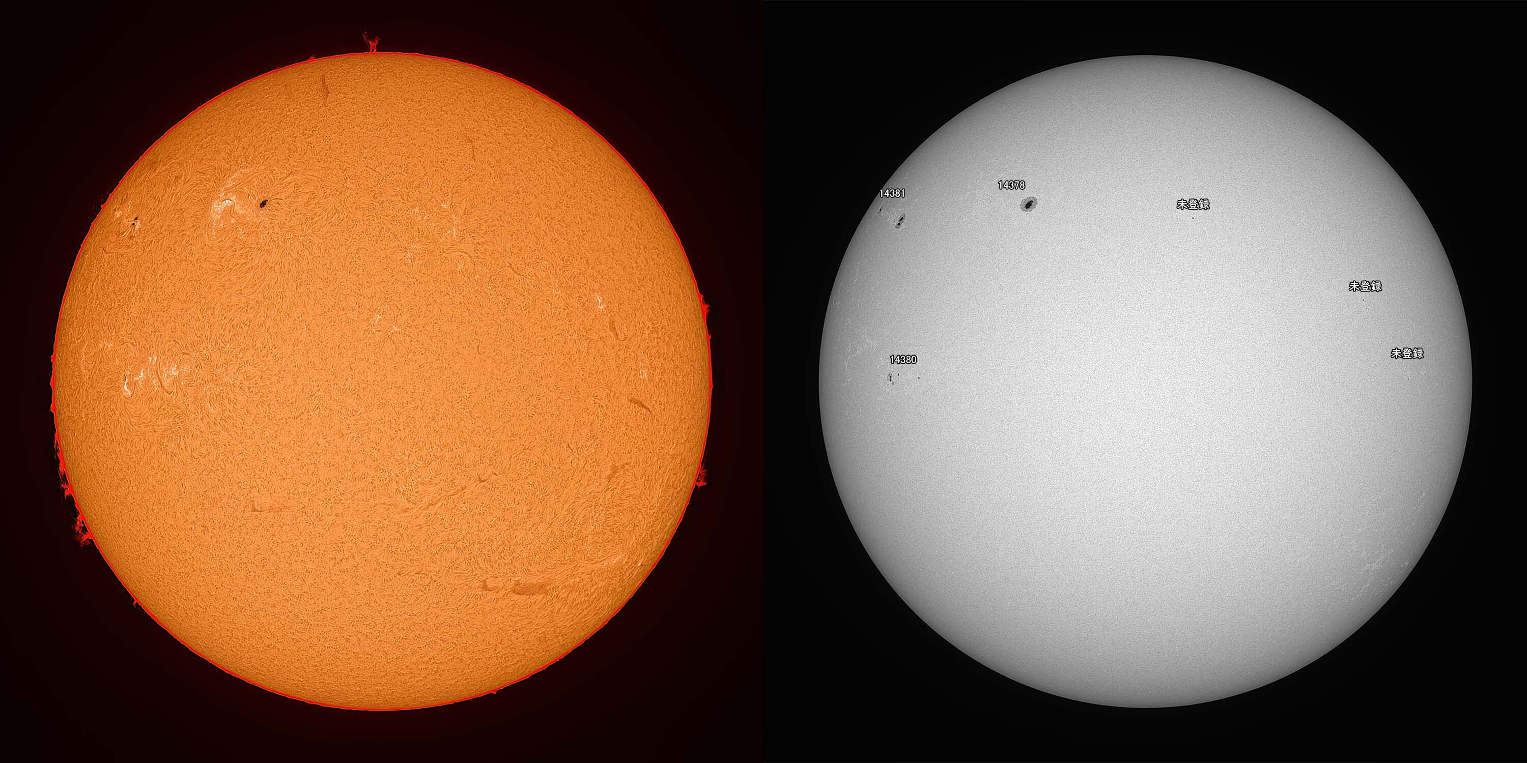 光球面:FireCapture、ROI 3600x2400、Gain 100、2.0msec x1000、撮影時間 31秒/プロミネンス:FireCapture、ROI 3600x2400、Gain 300、2.0msec x1000、撮影時間 31秒