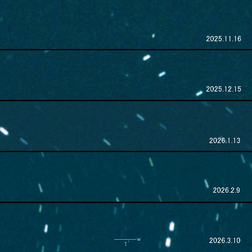 2025.11.15 → 16等級後半 2025.12.15 → 16等級前半 2026.1.13 → 15等級後半 2026.2.9 → 16等級後半 2026.3.10 → 17等級前半 現在は減光中です。 2026年6月11日が近日点ですが 地球との位置関係により2026年1月頃が明るさのピークでした。
