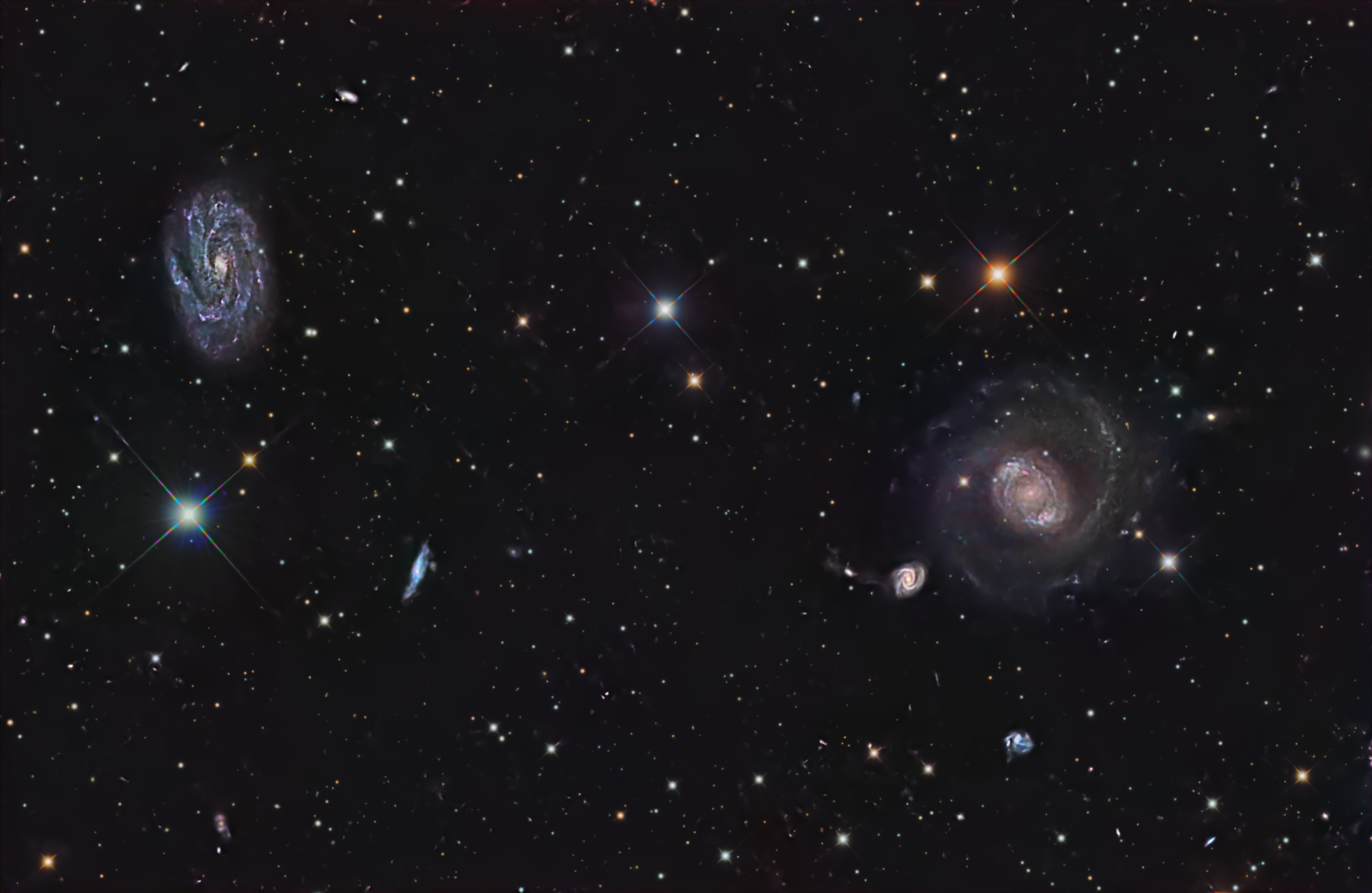りょうけん座の2つの銀河です。NGC4151(右)は中心に超巨大ブラックホールがあり、NGC4145は影響を受けているようです。左が北です。(バークレー)