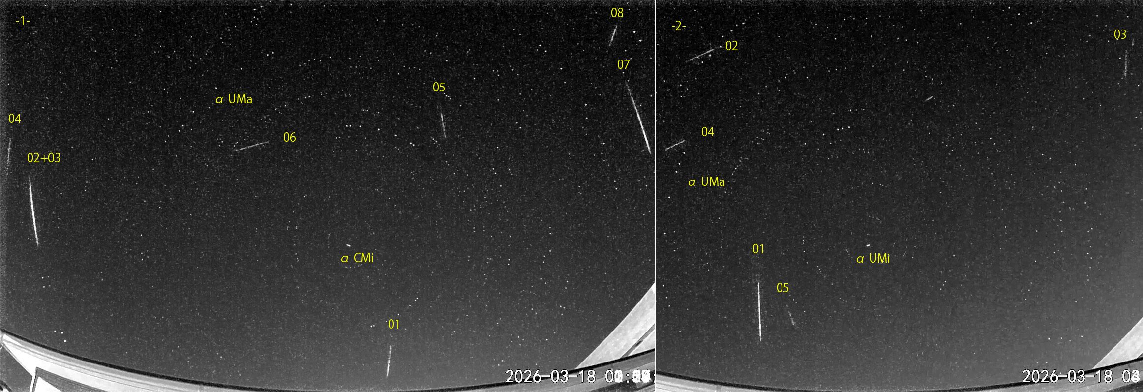 1) 00:13から約2時間の8コマを、2) 03:03から約2時間の5コマを処理しました。 出現した順に数字と記号を始点付近に記入。tは痕traceあり。 最近では活発な活動です。