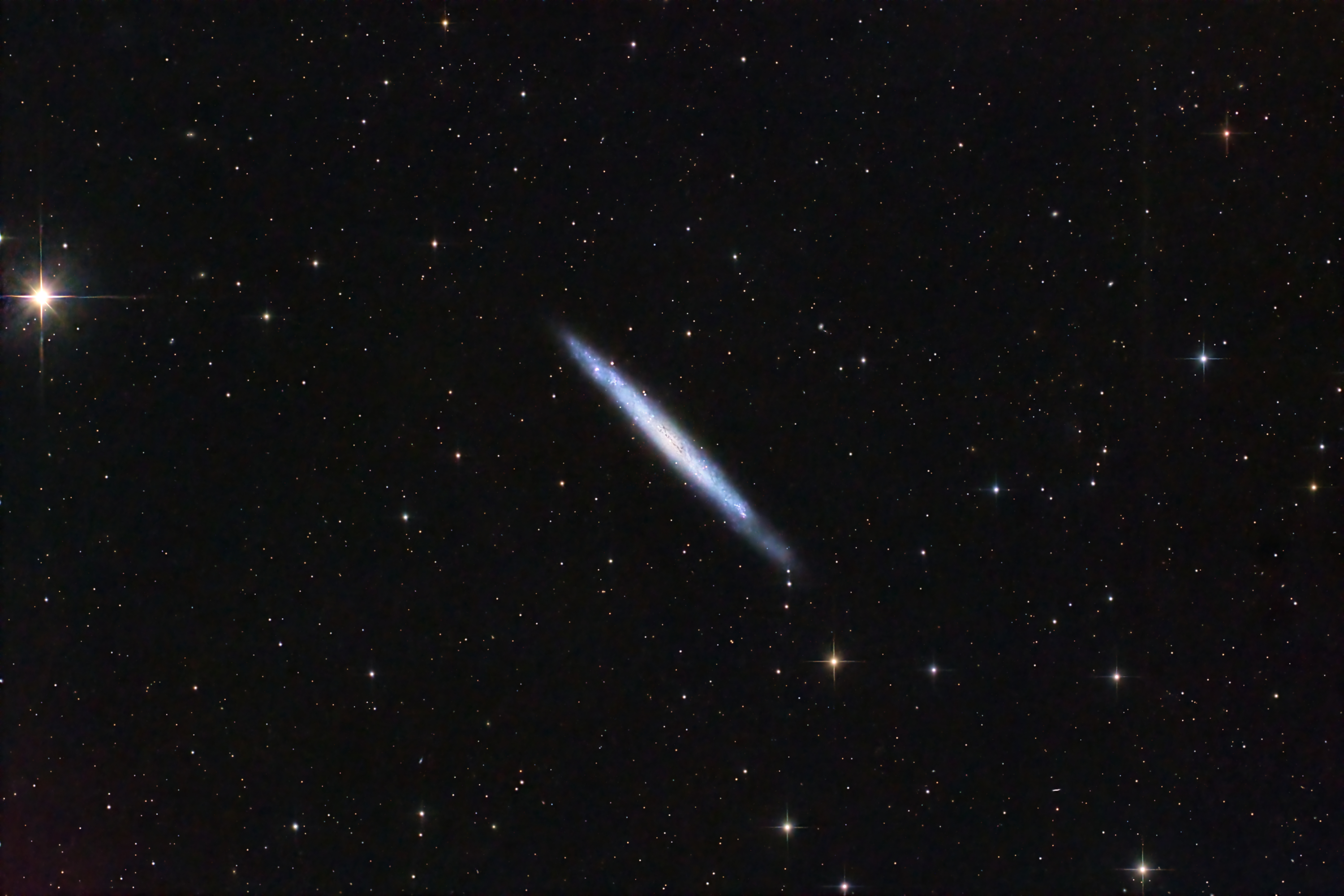りょうけん座にある見かけの長さが16分の大きなエッジオン銀河です。中央部の暗黒体や周辺の構造が見えています。撮影の後半は雲が出てきて、完全に曇り空になり、この日最後の撮影となってしまいました。