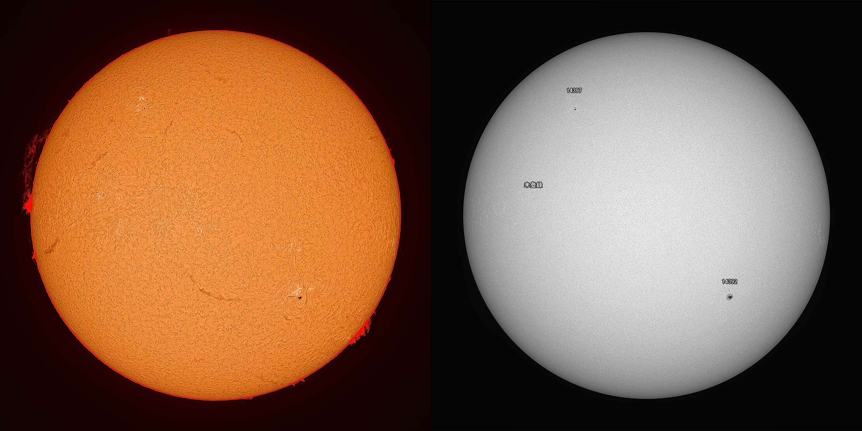 光球面:FireCapture、ROI 3600x2400、Gain 100、1.75msec x1000、撮影時間 31秒/プロミネンス:FireCapture、ROI 3600x2400、Gain 300、1.75msec x1000、撮影時間 31秒