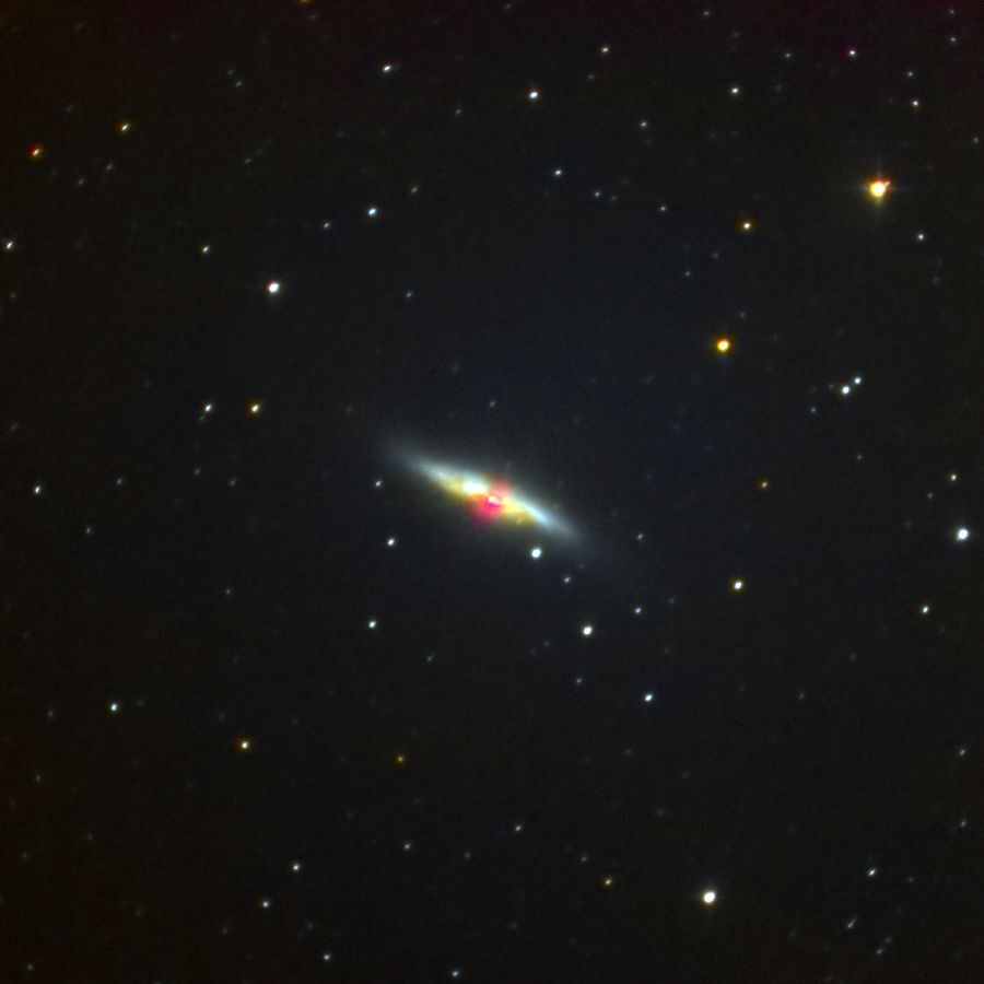 おおぐま座のスターバースト銀河M82(NGC3034)です。中心部から赤いスーパーウィンドが噴き出しています。この時間はまだ風が強く星像が歪んでいます。(片山 徹)