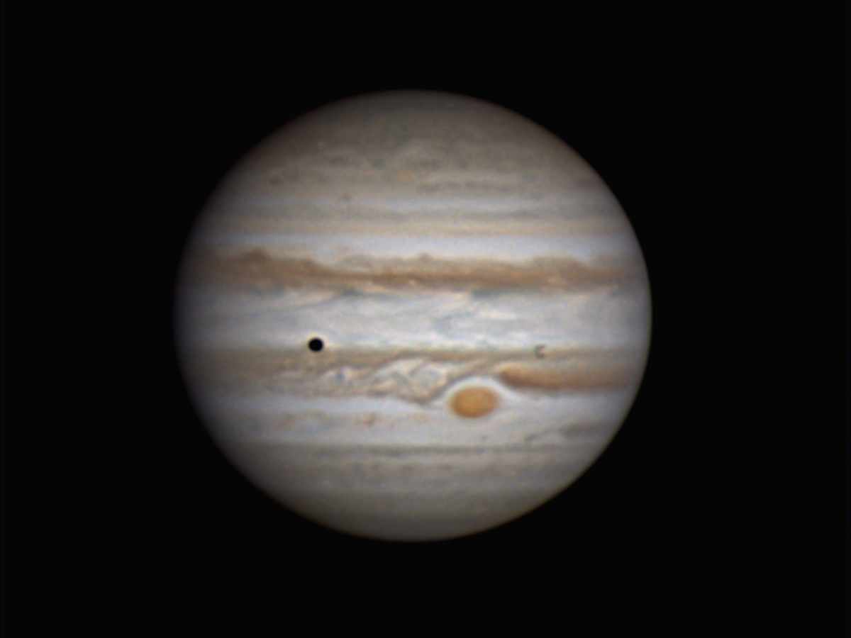 通過中の衛星イオとシャドー、大赤班がオンパレードでラッキーでした。 30分撮像した中でシーイングが一番良かったワンショット。