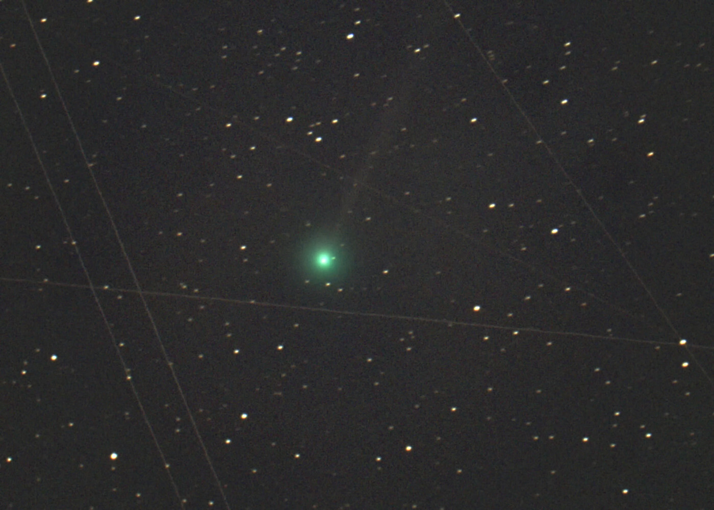 ガイドが乱れて星像が伸びてしまいました。比較的使えそうな画像のみの合成です。人工衛星が飛び交っています。