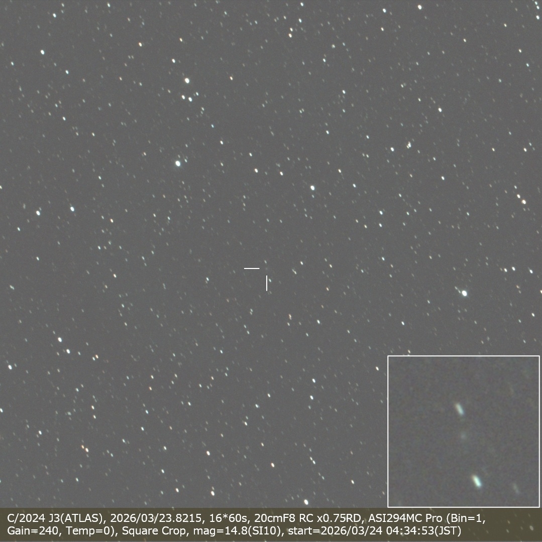 C/2024 J3(ATLAS), 2026/03/23.8215, 16*60s, 20cmF8 RC x0.75RD, ASI294MC Pro (Bin=1, Gain=240, Temp=0), Square Crop, mag=14.8(SI10)