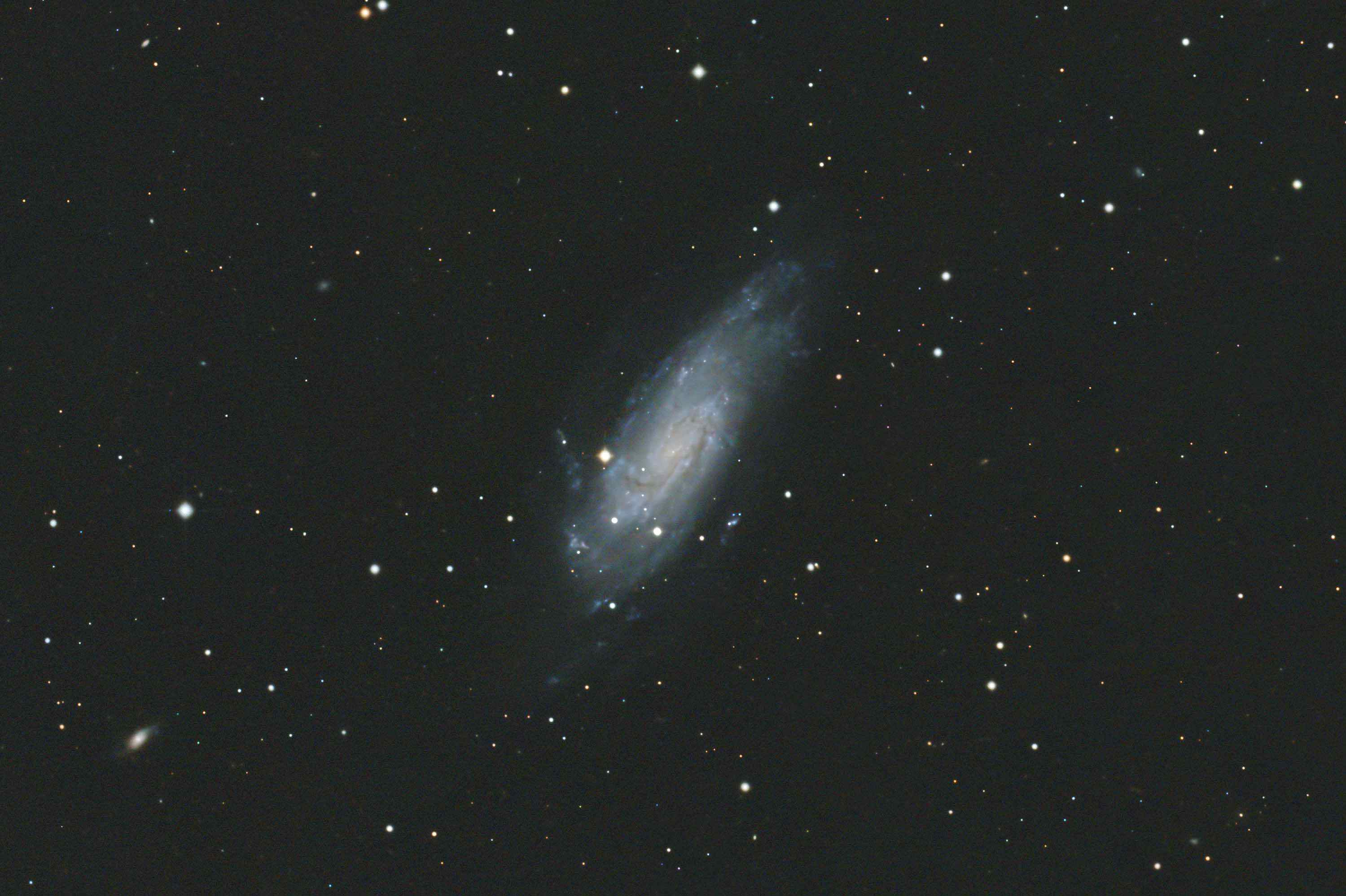 大きなわりに構造がはっきりしない銀河ですが、中心部から伸びる腕の構造が認められ渦巻銀河を斜めから見ていることがわかります。 露出中に薄雲がかかったため星像に影響が出ています。