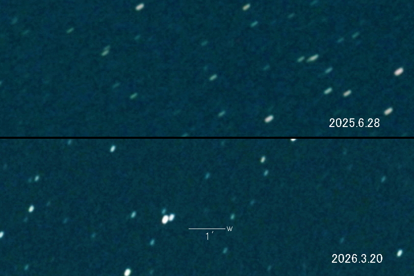 2025.6.28 → 17等級前半 2026.3.20 → 17等級後半 2026年2月20日が近日点でした。 2025年夏と2026年夏に17等級という予想です。