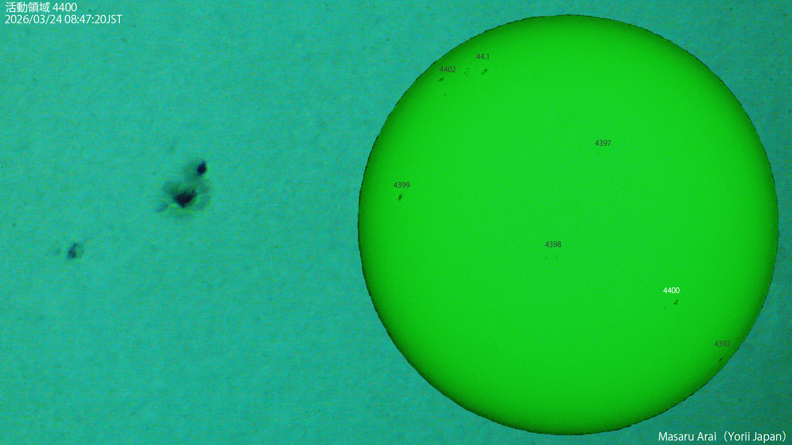 SE120L+DMC-GH1よる 4400 ( Dao/Dai ) です。 活動領域4401などでCクラスフレアが数回発生し、最大のものは、活動領域4392で23日9時12分JSTに発生したC3.4フレアでした。