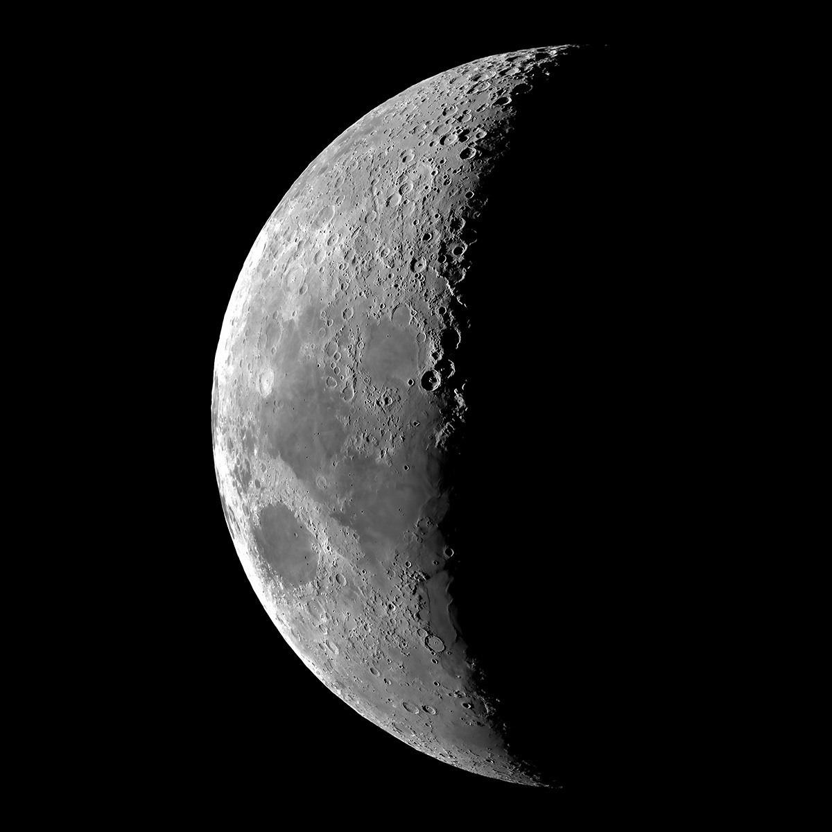 桜も開花して春らしくなってきました。神酒の海西岸に並ぶカタリナ、キリルス、テオフィルスの3連クレーターが欠け際で異彩を放っています。まだ冬の名残が残る気流条件ですが、月面全景であれば、そこそこの画になります。