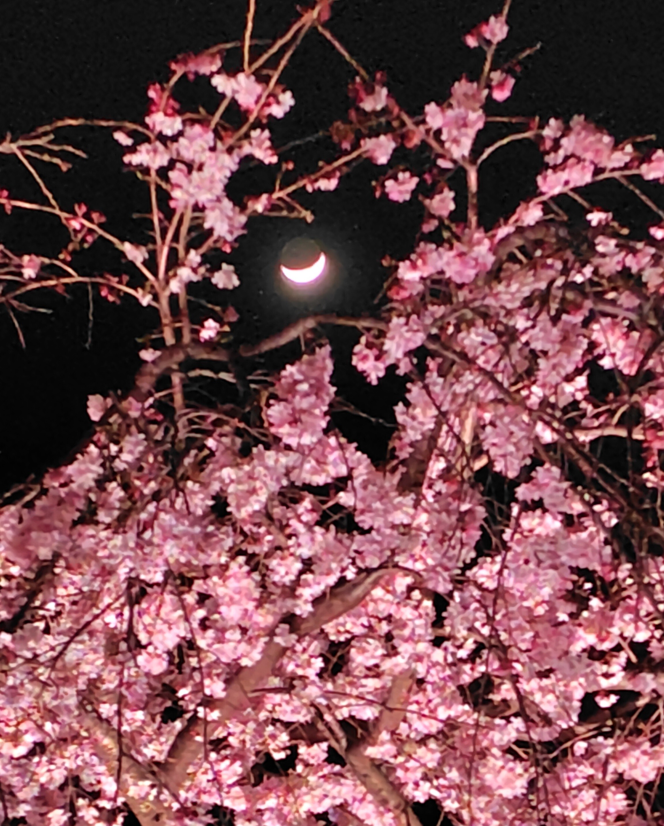 山下公園のライトアップ枝垂桜から透かした月とプレアデスです。 スマホですが、せっかくの光景なので無理やり撮ってみました。
