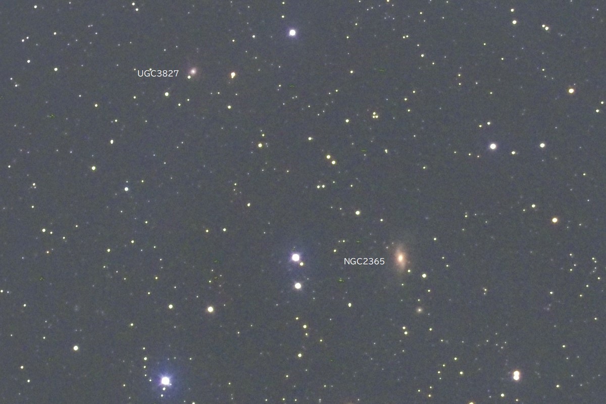 「ふたご座」δ星(デルタ)の東0.54度付近に位置します。 明るさとタイプは、NGC2365が12.19等(V)_SA、UGC3827が14.80等(B)_SB?です。